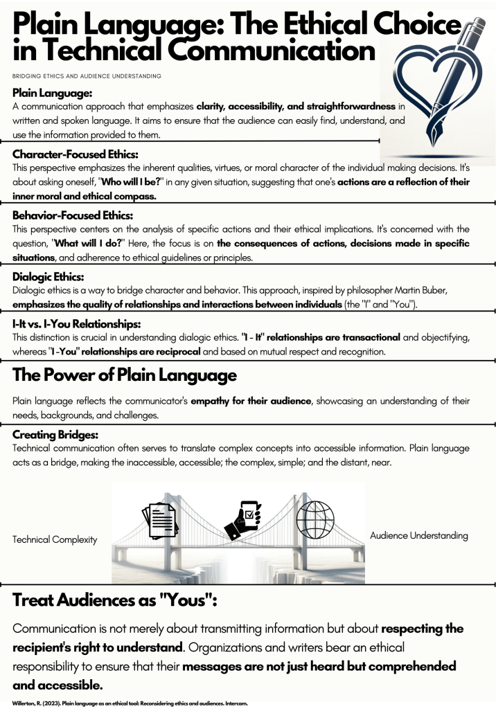 In this project, I leveraged design principles to distill complex ethical concepts in technical communication into an engaging infographic that speaks to a broad audience. It highlights plain language as an ethical necessity, underscoring empathy and responsibility, and transforms abstract ethics into practical insights for communicators.